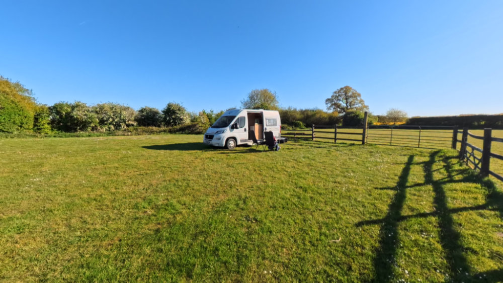 As ‘CL’s go, this one is a corker. It’s a small field designed to hold no more than 5 caravans/motorhomes, with a tap and chemical disposal area tucked away under some trees. Only, as with the best of its kind, we are the only van on site, which means we have it all to ourselves… all of which gives it something of a ‘wild camping’ vibe… all for just a tenner, which makes me like it even more.