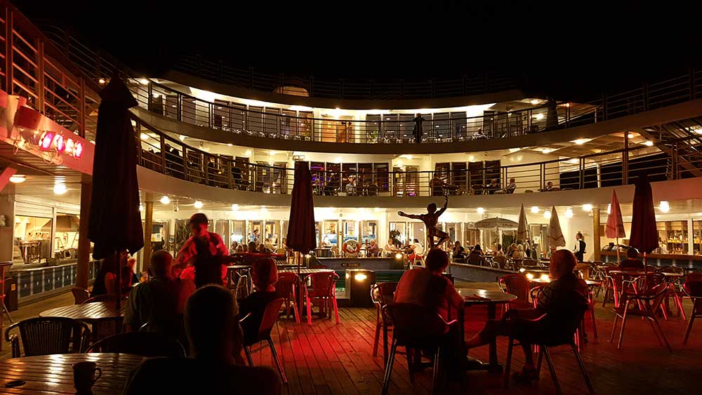 We spent the afternoon in the Columbus Lounge because that seems to be the coolest public place on the ship at the moment (but don’t tell everybody otherwise there will never be any empty chairs there…). After a late afternoon cup of tea, we headed up to the top deck, where the temperature was at a more tolerable level, and watched the sun set. We weren’t alone up there; there is something very magical, and slightly eerie, about watching the sun set in the middle of the Atlantic Ocean, where nothing but sea can be seen in every direction; no land, no birds, no other ships, and to Robin, the wildlife lecturer’s, disappointment, no whales or dolphins.