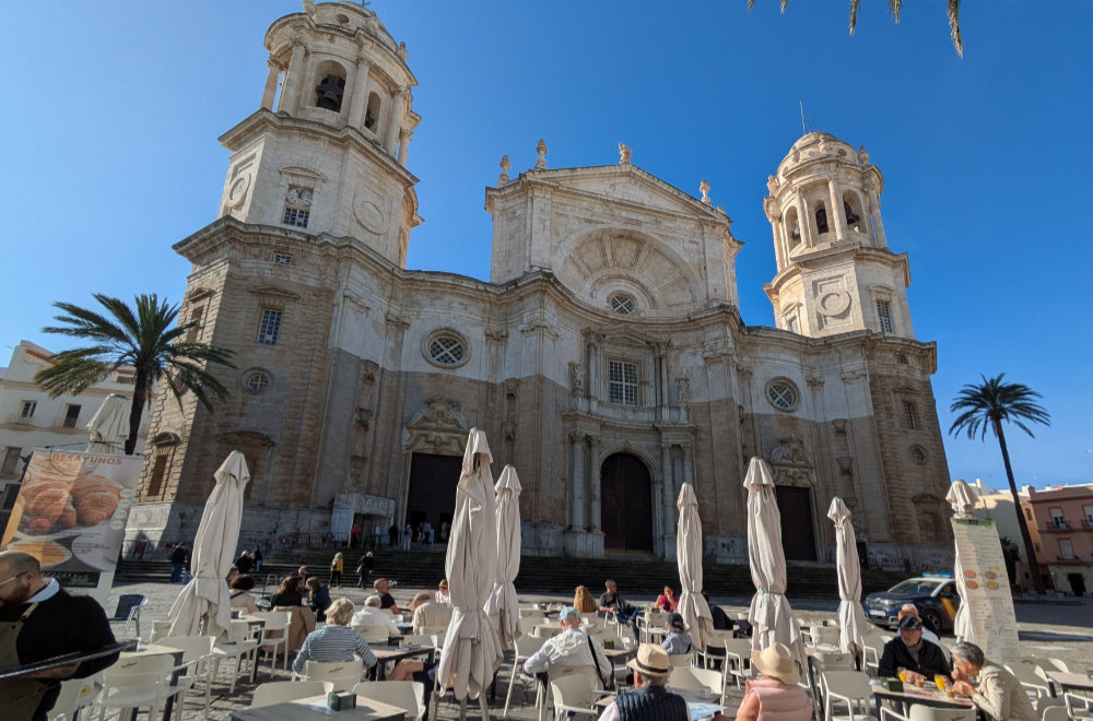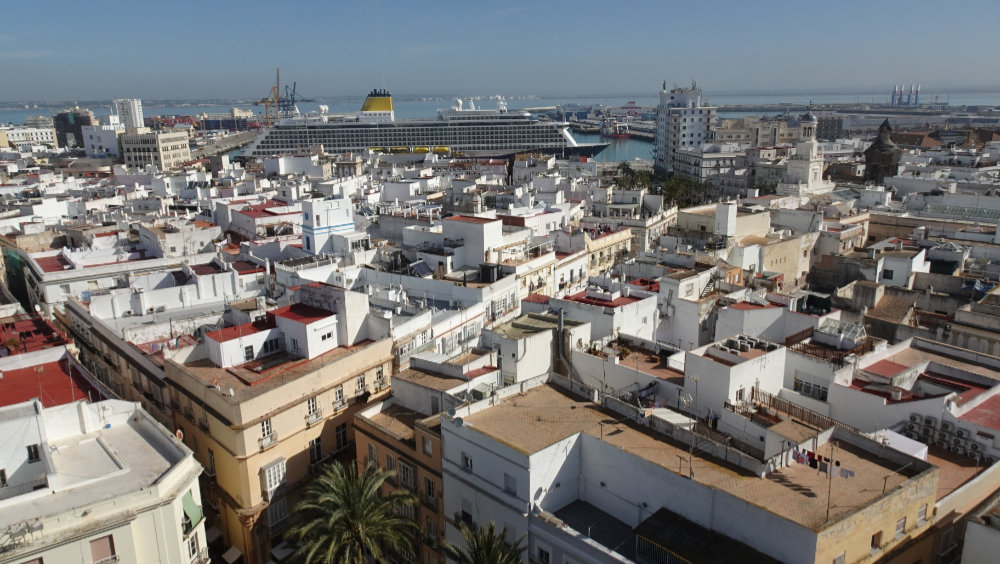Not having to set the alarm to be up at the crack of dawn was bliss, and even nicer – after enjoying a lesiurely breakfast – to step ashore and feel the ground beneath our feet. I’ve been to Cadiz before, many years ago, and don’t remember it; Tracey has never been here before; our first impressions were good. Last night, we watched Keith Williams’ port lecture on the cabin TV to help give us some pointers, and were encouraged by the fact that Cadiz is actually quite compact, and most of it can be accessed very easily, directly from the ship (so, no shuttle buses required).