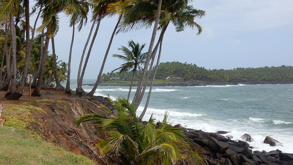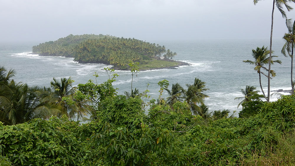 The wind always howls and the surf is quite wild along the first stretch of the walk, with St Joseph visible a short way off to our right (we chose to walk anti-clockwise, as we always do), and the palm trees fair bend in the wind. As we turned the corner, Devil’s Island came into view. No-one is allowed on the island now; in Papillon’s day, all the trees were removed to prevent the prisoners from building boats. Now, however, the trees have grown back, and in a clearing one of the small prisoner’s huts is visible (possibly the hut that Papillon himself resided in, since the literature tells us that his hut is clearly visible).