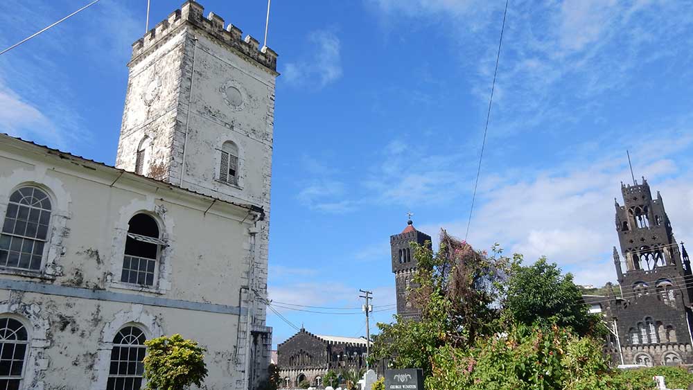 In Kingstown, we went for a walk with Robin, the Whale and Dolphin lecturer, and his wife, Chris. We walked through the busy town to the church with stained glass windows featuring red angels, spent a while photographing wildlife in the churchyard, and then visited the quirky church that looks like its been stuck together from lots of different churches of different styles and periods. Finally, we walked back to the ship via the fish market, popping into a supermarket along the way to stock up on some large bottles of mineral water.