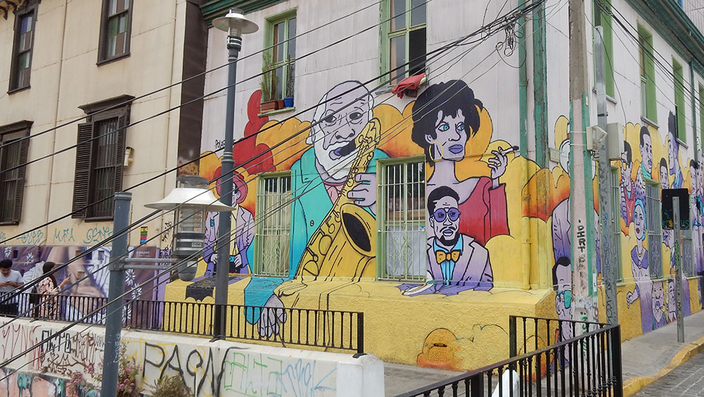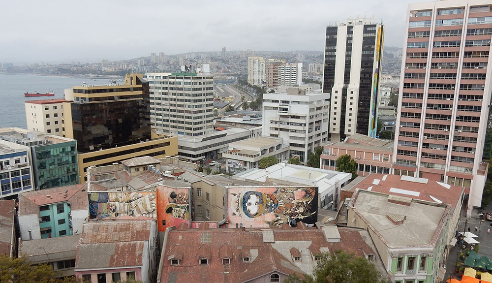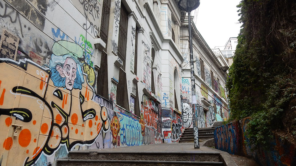 Valparaiso is built on several hills. Many of the buildings, as far as you can see, climbing up the sides of the hills, are multi-coloured, yet in the newer parts of the city, these are looked down upon from hideous-looking high-rise buildings. Once we’d reached the Old Town, we climbed one of the many flights of steps, where the walls are riddled with graffiti, to the upper quarter, which is also accessible via several funicular railways.